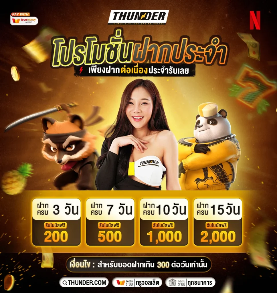 หนึ่งในโปรโมชั่นเด่นของ Thunder คือ “ฝากครั้งแรก รับโบนัสทันที” ที่ไม่ต้องใช้เงื่อนไขยุ่งยาก ช่วยให้ผู้เล่นใหม่เริ่มต้นได้ด้วยความมั่นใจ และสำหรับสมาชิกเก่า Thunder มีระบบสะสมแต้มแลกรางวัลที่ใช้งานง่ายและโปร่งใส ทุกยอดเดิมพันจะถูกคำนวณแบบเรียลไทม์ เพื่อให้คุณไม่พลาดทุกสิทธิ์พิเศษ เช่น โบนัสเกมสล็อต โบนัสคืนเงินสด และแคมเปญพิเศษช่วงเทศกาล ที่รับรองได้ว่าคุณจะไม่รู้สึกเบื่อหรือซ้ำซากกับการเล่นพนันออนไลน์อีกต่อไป